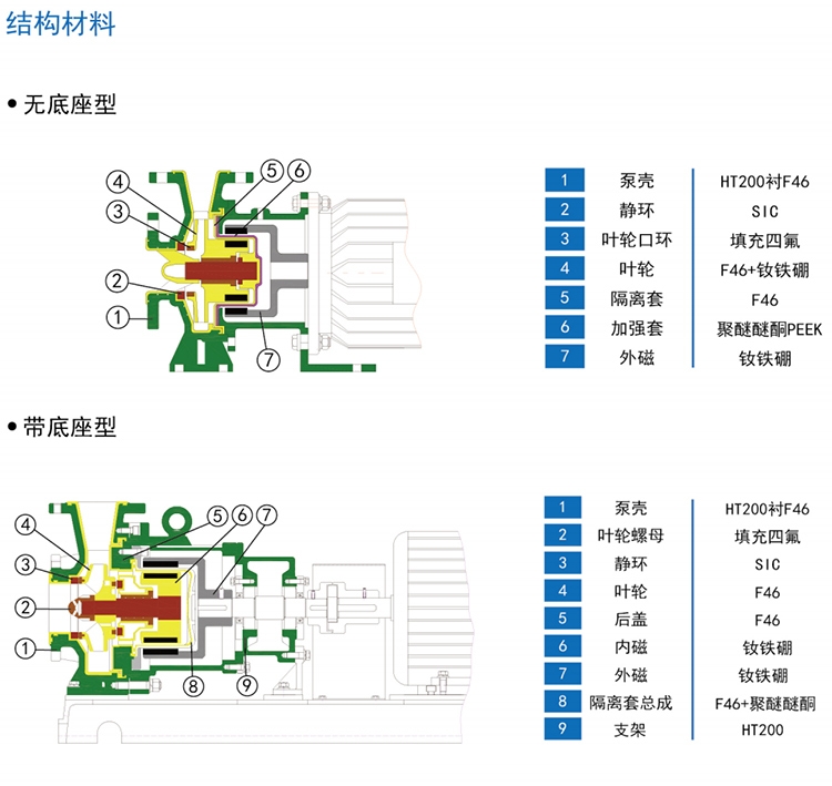 結(jié)構(gòu)上:WJC-FJ磁力泵全系列均采用主軸不動,轉(zhuǎn)子與葉輪為一體式,全封閉無泄露設(shè)計,整泵采用后拉式拆裝結(jié)構(gòu),安裝拆卸非常方便。